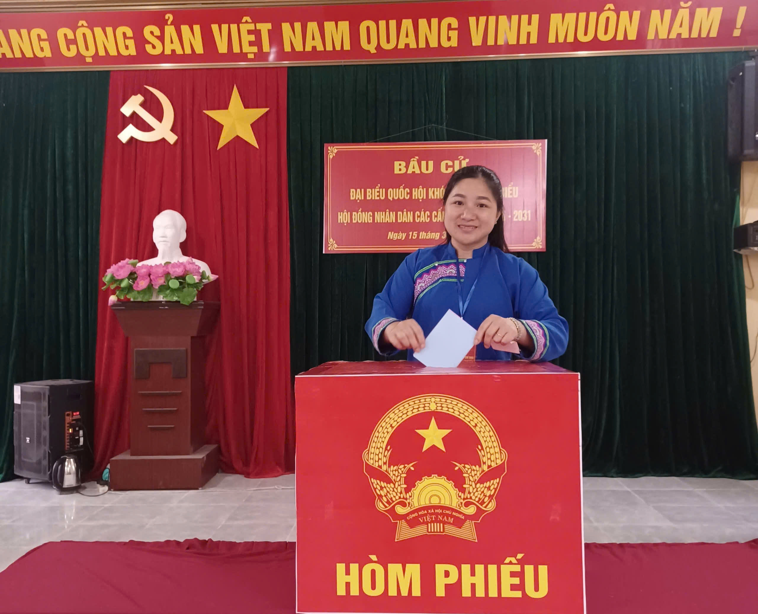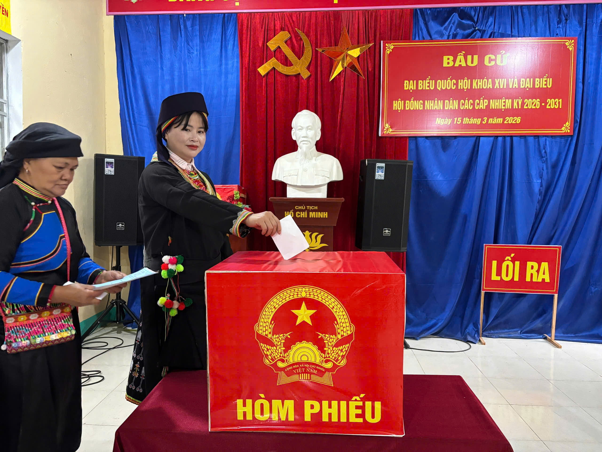 Cử tri trong trang phục dân tộc tham gia bỏ phiếu bầu cử tại Khu vực bỏ phiếu Nhà văn hóa thôn Đoàn Kết