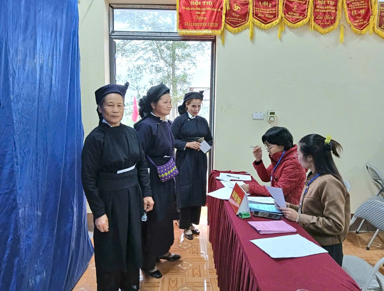 Các cử tri trong trang phục dân tộc Tày truyền thống đến bầu cử tại Khu vực bỏ phiếu Nhà văn hóa thôn Nà Ro