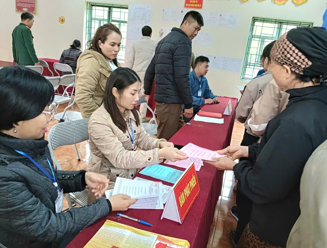 Bên cạnh đó, các tổ bầu cử thực hành quy trình bỏ phiếu gồm 6 bước: Đón tiếp, hướng dẫn và kiểm tra thẻ cử tri; phát phiếu bầu đúng màu quy định cho từng cấp; hướng dẫn cử tri tìm hiểu thông tin ứng cử viên tại bàn viết phiếu; hướng dẫn viết phiếu bảo đảm nguyên tắc bỏ phiếu kín; cử tri tự tay bỏ phiếu vào hòm phiếu; đóng dấu “Đã bỏ phiếu” vào Thẻ cử tri đã bỏ phiếu bầu xong. Cùng với đó, diễn tập quy trình sử dụng hòm phiếu lưu động.