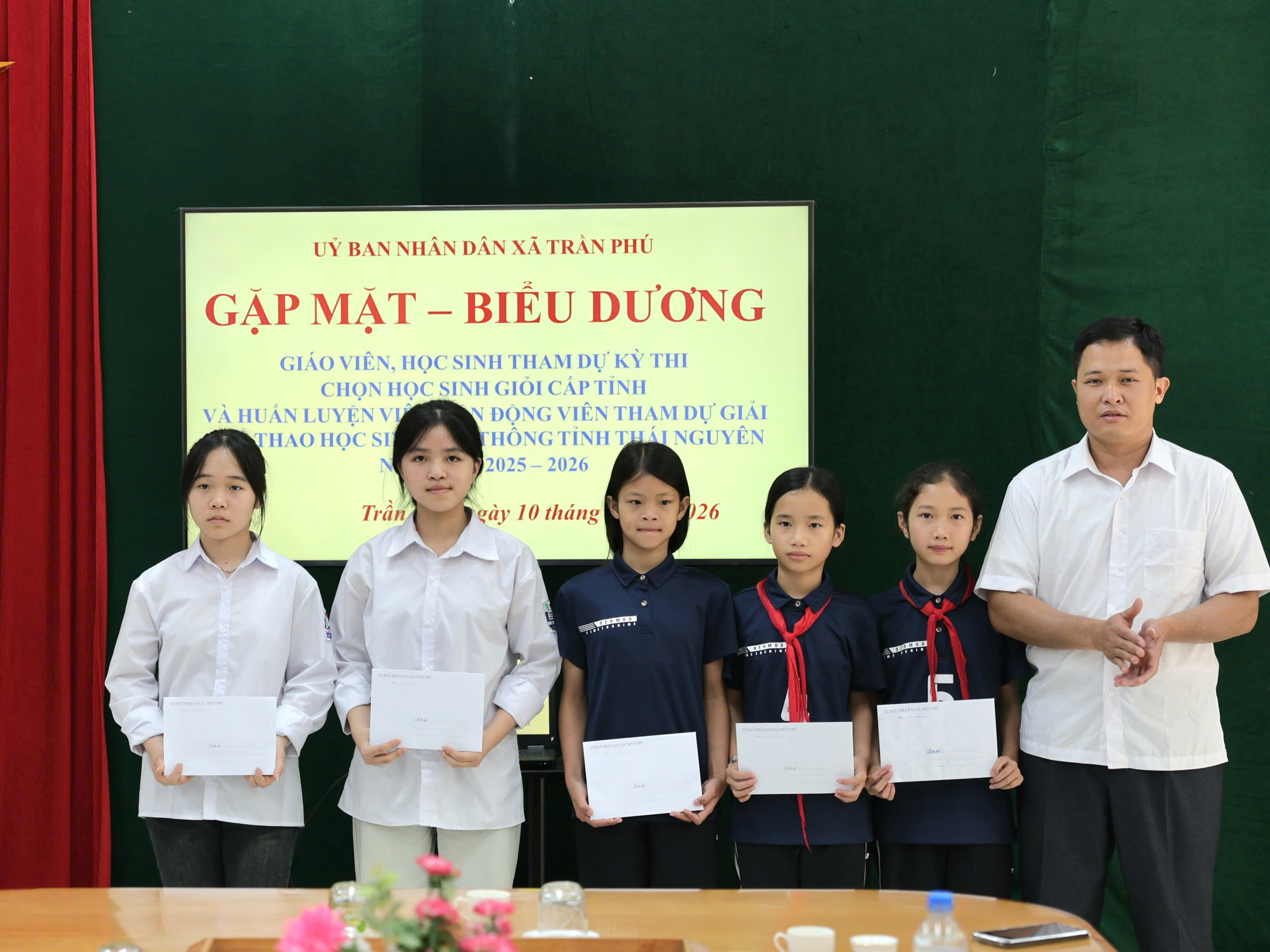 Sáng 10/4, Ủy ban nhân dân xã Trần Phú tổ chức gặp mặt, biểu dương giáo viên, học sinh tham dự kỳ thi chọn học sinh giỏi cấp tỉnh và huấn luyện viên, vận động viên tham dự Giải thể thao học sinh phổ thông tỉnh Thái Nguyên năm học 2025 – 2026.