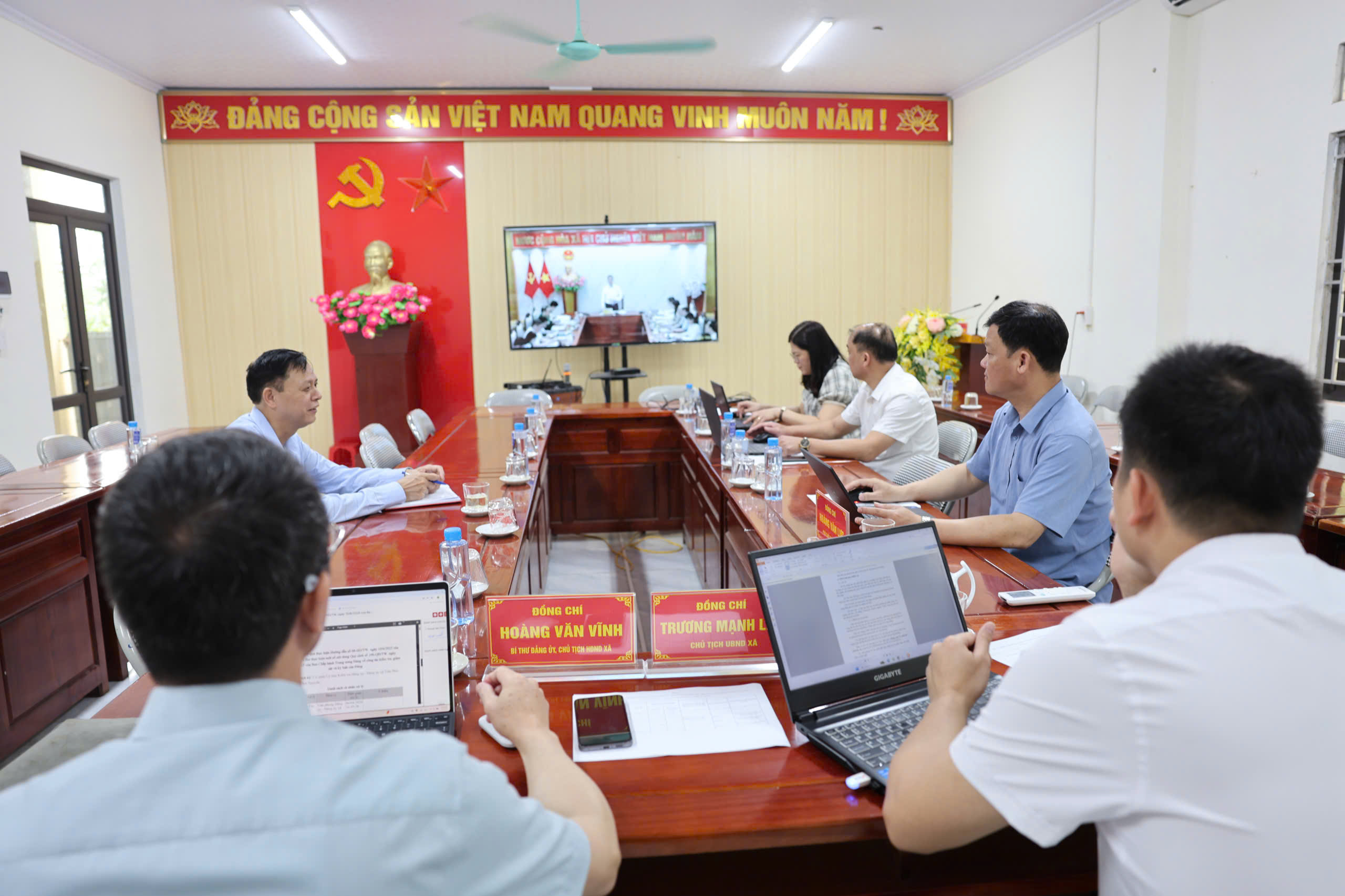 Đồng chí Hoàng Văn Vĩnh, Bí thư Đảng ủy Chủ tịch Hội đồng nhân dân xã; đồng chí Trương Mạnh Linh, Phó Bí thư Đảng ủy, Chủ tịch UBND xã dự Hội nghị tại điểm cầu của xã