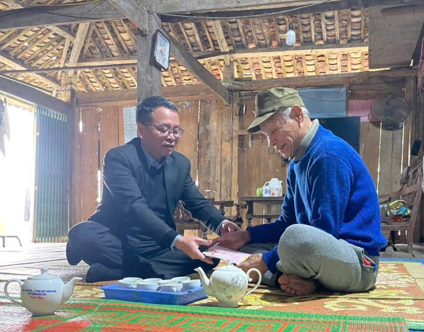 Đồng chí Hoàng Văn Vĩnh, Bí thư Đảng ủy, Chủ tịch HĐND xã tặng quà Người có công với cách mạng (Nguồn ảnh: Phòng Văn hóa - Xã hội)